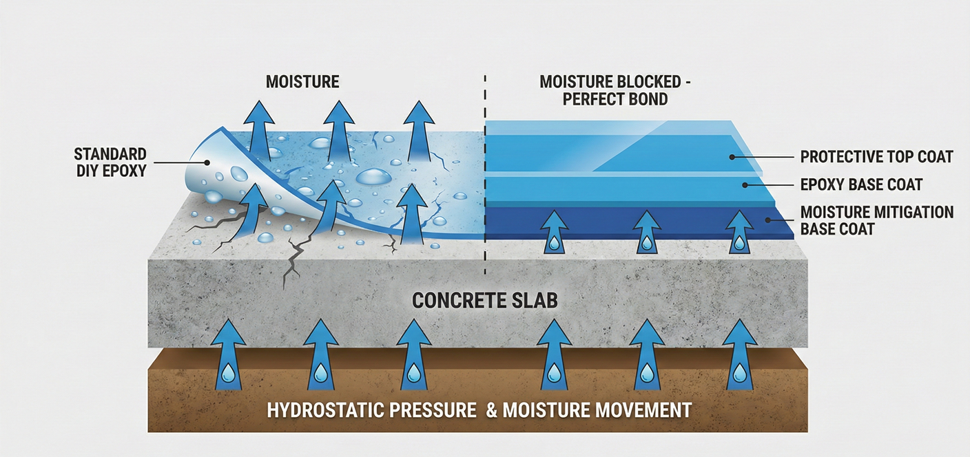 This is why our process includes a mandatory moisture assessment. We don't simply apply a coating over concrete. When conditions require it, we incorporate specialized moisture-mitigation primers designed to bond with the substrate and reduce the risk of vapor-related failures.